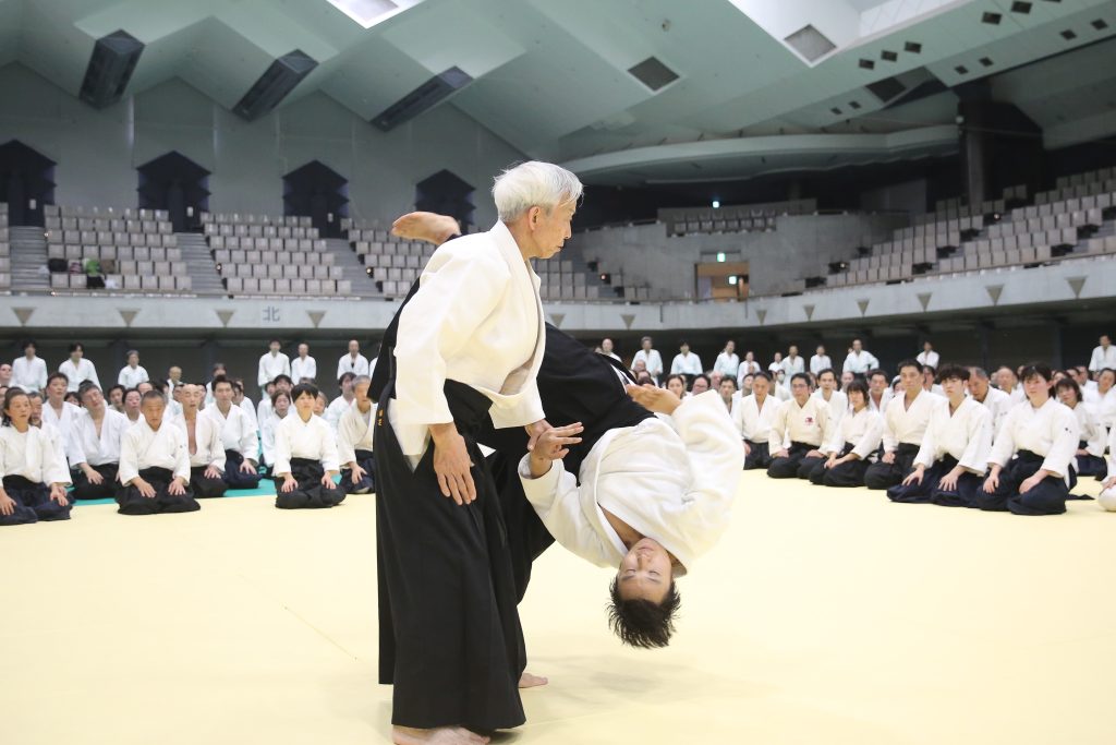 講習会は入身、転換、丸い動きといった基本的な動きそして呼吸法、すべての技がこれらを使ってできていること、それが様々な技につながっていることを、見取りを通じてお示しいただいた。途中、阿吽の呼吸で道主から本部道場長に交代され、本部道場長からは半身半立ち、座技、そしてまた異なった攻撃からの技を、道主の言われた内容を一貫したかたちで、力強く稽古をいただいた。最後は呼吸をおちつけるように、再び道主によって締められ、汗だくになりながらもそのことすら忘れる一時間半の稽古となった。錬成大会のあと、道主・本部道場長に花束が贈呈され、大きな拍手が贈られた。小柳副理事長による閉会の辞により錬成大会は幕を閉じた。
